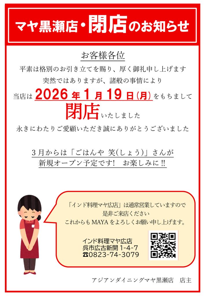 アジアンダイニングマヤ黒瀬店 閉店のお知らせ
